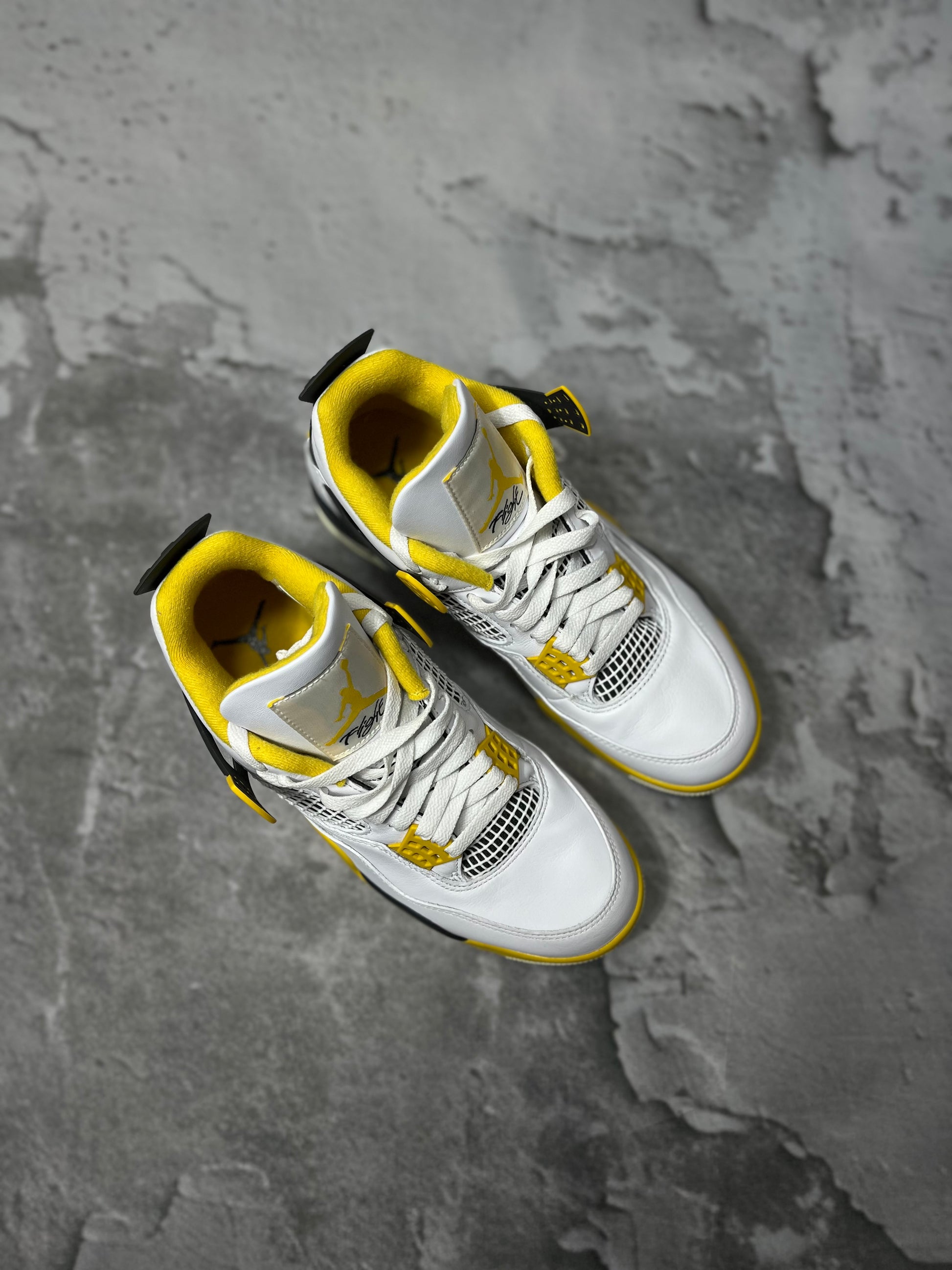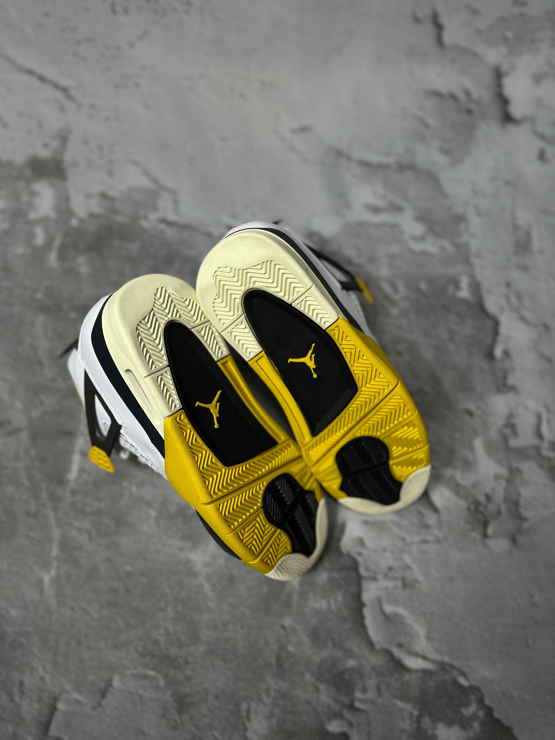 Step into bold style with the Air Jordan 4 "Vivid Sulfur", a fresh twist on the iconic silhouette. Featuring a clean white leather upper, this pair is accented with vibrant yellow sulfur hits and contrasting black detailing, delivering a perfect balance of energy and edge. The classic mesh paneling, signature Air cushioning, and sturdy rubber outsole ensure comfort and performance with every step.