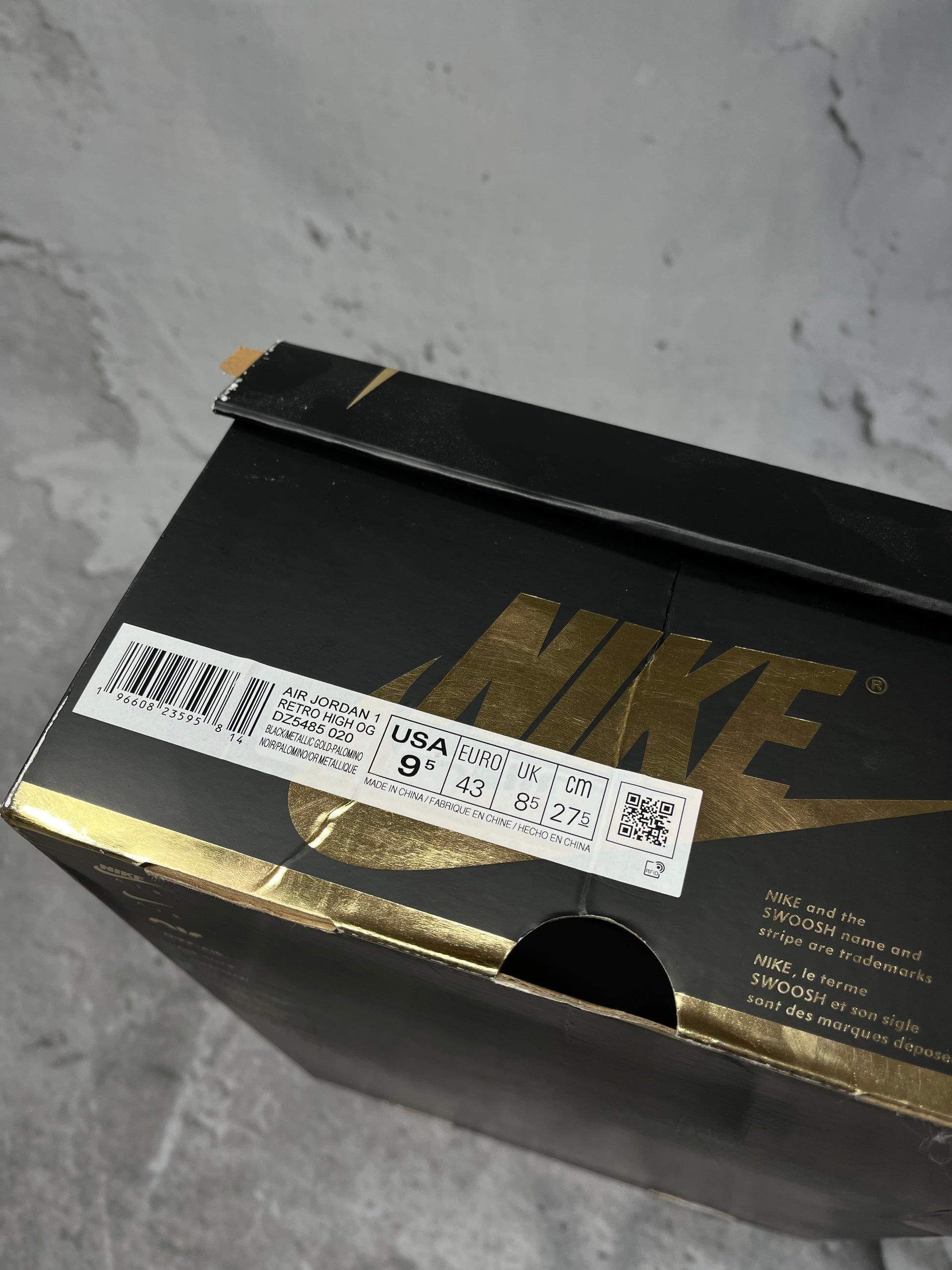 Partea superioară prezintă o combinație de straturi inferioare din nubuc negru și suprapuneri din piele întoarsă Palomino maro închis , oferind un contrast îndrăzneț, dar sofisticat. Un logo Nike Air auriu metalic pe limba din nailon adaugă o pată subtilă de culoare și face trimitere la brandingul tradițional.